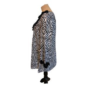 This new with tags Mud Pie beach to bar cover up is a stylish and versatile cover-up perfect for the beach, pool, or casual outing. Featuring a trendy diamond pattern with fringe accents, this size small tunic is made from 100% cotton in classic black and white colors. With 3/4 sleeves and a bohemian theme, this machine washable garment is easy to care for and sure to make a statement with its 70s-inspired design. Whether you're lounging by the water or just out for a day of fun, the Mud Pie beach to bar cover up is a must-have addition to your summer wardrobe.