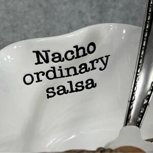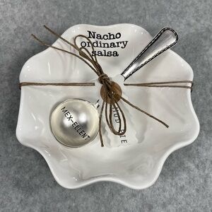 Mud Pie Nacho Ordinary Salsa Dish Embossed Spoon Set Serve Ware White Ceramic