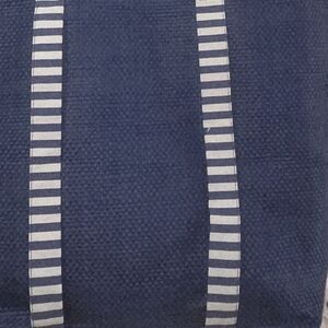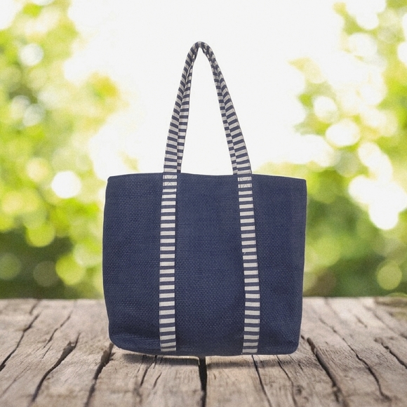 Stylish navy tote bag with chic striped handles. Perfect for everyday use.