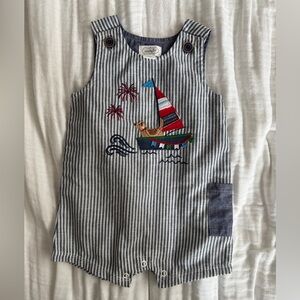 Charming baby romper with navy and white stripes. Features a playful sailboat design.