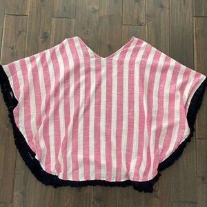 Mud Pie Pink and White Striped V-Neck Fringe Poncho Swimsuit Cover Up. Vertical stripes with navy blue fringe. One Size.