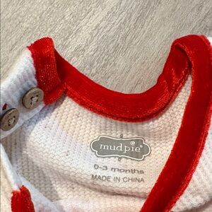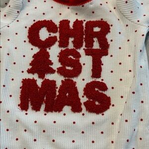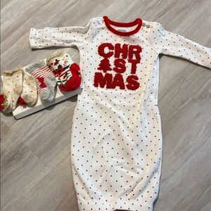 Charming baby gown with festive red accents. Ideal for holiday celebrations. Comes with Christmas socks