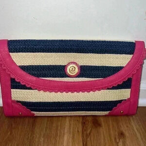 Mud Pie Stripe Straw Scallop Clutch. New with tag. Measures approximately 12.5” x 8” x 2”. Non-smoking home.