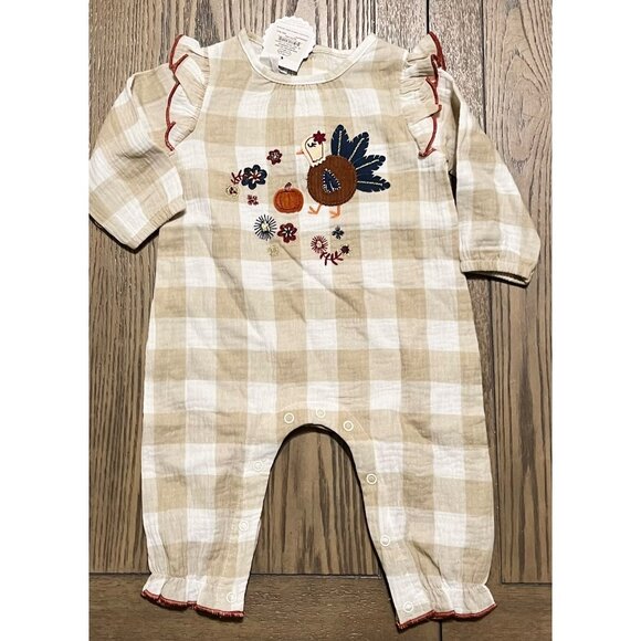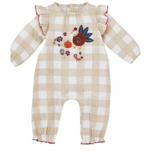 Mud Pie Thanksgiving turkey fall romper jumpsuit 6-9m NWT applique gingham
