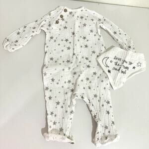 Mud Pie White & Gray Star Gauze Romper & Bandana Bib Outfit Set Size 3-6 Months