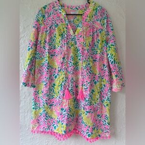 Mud Pie Women’s Swim Cover Up Palm Print Green & Pink Pom-Pom Tassel Size Medium