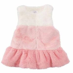 Faux fur color-block vest features long pile minky lining, flounce hem and hook and eye top closure with pink and white.