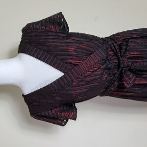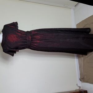 MudCloth elegant women's dress Size M features a stunning black and red design, perfect for any occasion. The dress offers a flattering fit with a belted elastic waist fluttered sleeve side slit at the hem V-neck with cross over front. Approximate measurements Pit-Pit flat 17" waist 14" without stretch lined 33" from shoulder to hem length of dress from shoulder to hem 59"