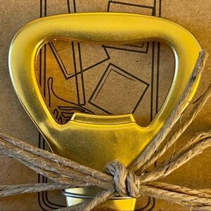 Wood and metal bottle opener comes on drink recipe display card. “Bottoms Up!”