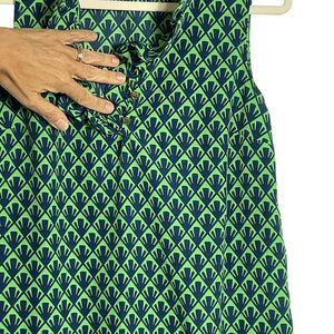 Mud Pie Ruffle Neck Dress, Blue/Green print, 2 gold buttons, size large, poly