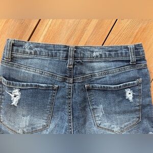 Trendy blue jean shorts. Features distressed details with embroidered flowers. Perfect for festivals or casual date night.