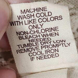 Fabric Care Instructions: Machine wash cold with like colors, only non-chlorine bleach when needed, tumble dry low, remove promptly, cool iron if needed
