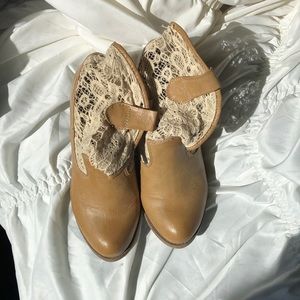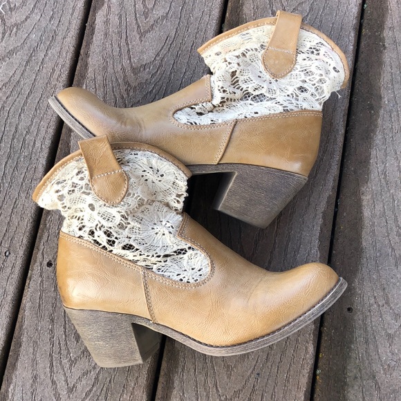 Slouchy lace Mudd booties. Only worn a handful of times. Very light pink stain on top of lace of one boot, hardly noticeable.