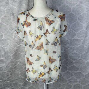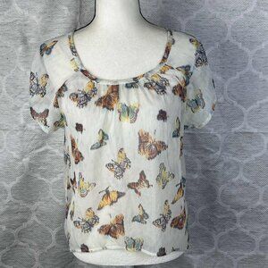 Mudd Butterfly Print Boho Top Size L | Sheer Mesh Cap Sleeve Blouse