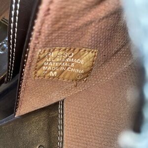 This womens brown leather pair of Mudd casual mules has a few scuffs.