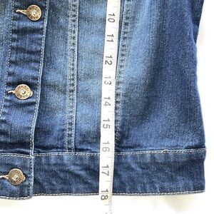 Approximate measurements in photos. Excellent condition. Size: Small, Distressed Blue, Button Closure, 2 Pockets, 67% Cotton, 10% Rayon, 22% Polyester, 1% Spandex