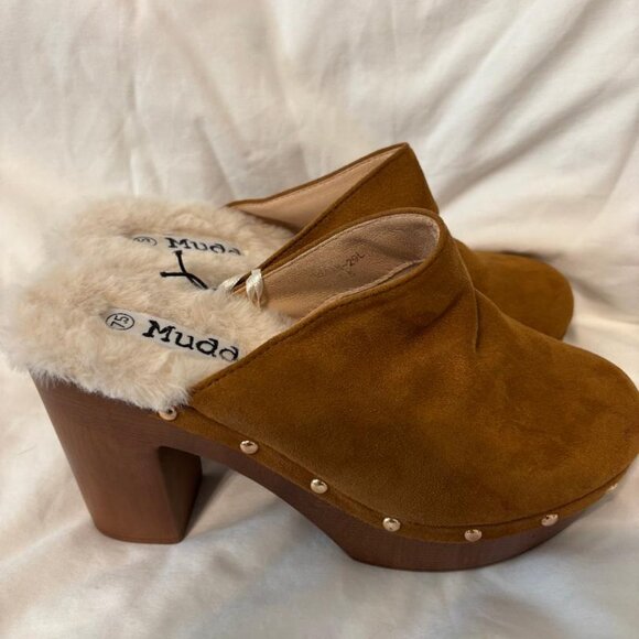 Mudd (Y2k/90's retro style) brown faux suede clogs with faux fur lining, chunky heel & studded trim. Looks like these clogs have never been worn. Size 7.5. C0032