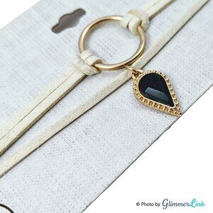 1 cream faux suede single strand choker necklace accented with a brown faceted teardrop. It measures approximately 14" long with a gold tone lobster claw clasp and it has an additional 3" long chain extender.