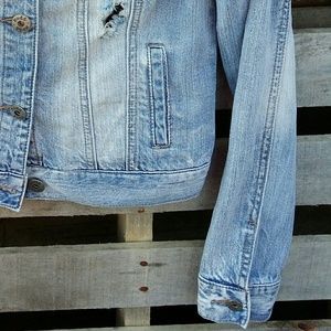 Cyber Monday deal...*Like New** Super soft distressed denim jacket. 5 button front with 2 button flap pockets. Side slit pockets and single button cuffs. Bottom back button tabs. 100% cotton.