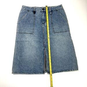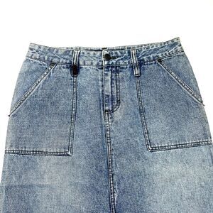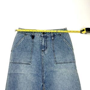 The Mudd denim skirt is a timeless piece perfect for a casual, retro-inspired look. Made from 100% cotton denim in a solid blue color, this midi-length skirt features a button front closure and a flattering straight & pencil style. With a mid-rise and pockets adding to its functionality, this skirt is ideal for all seasons and perfect for those who love a vintage vibe. The brand's juniors size 5 ensures a comfortable and stylish fit for women looking to add a classic denim skirt to their wardrobe.