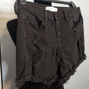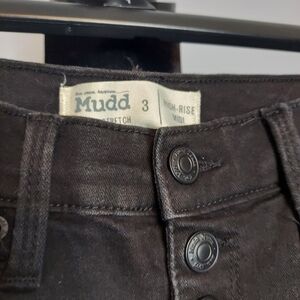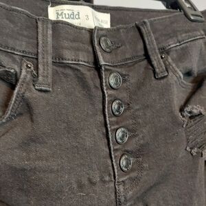 •Mudd FLX Stretch High-Rise Midi Black Size 3 Juniors. In good pre-owned condition. The shorts are denim distressed frayed. Has 5 buttons for closure. Has two front pockets, affront coinpocket and two back pockets. Bundle for a better price!