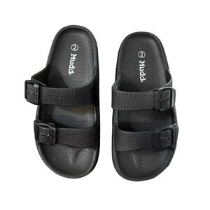 These Mudd girls' sandals are perfect for a casual and comfortable summer or spring day at the beach. The slip-on style and open round toe design make them easy to wear and they come in a solid black color that will match any outfit. These sandals are made by the trusted brand Mudd and have a US shoe size of 2. Their performance and activity are ideal for a day at the beach. The sandals are not signed, vintage, or personalized. They are a basic and stylish addition to any girl's wardrobe. These sandals have a slip-on closure and are made in China.