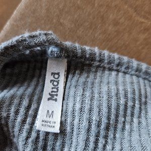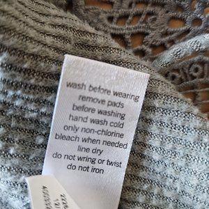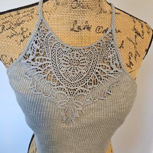 This is a cute halter top. The brand is Mudd. This was purchased at Kohl's for my daughter. She only wore it a couple of times. It is size medium and the color is a green/gray. It has a pretty lace decoration a the front neck and "t" like strap at the back. There is a lining panel across the bust in the same fabric. It measures 15 inches across the bust. The back fabric is 7 inches wide and the front is 12.5 inches from neck to hem. Very good condition. Ships from my smoke free, pet friendly home.