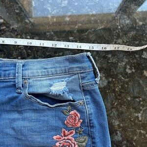 Mudd High Rise Shortie Flx Stretch embroidered floral Jean shorts. EUC. Festival