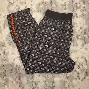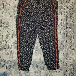 Soft woven jogger pants with tie waist, high rise. Elasticized waistband and ankle cuffs. Black and white print with orange. Ankle length, Soft and stretchy polyester/spandex.