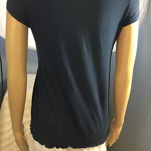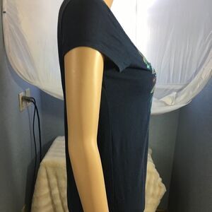 This Black Top is embroidered with a peacock design with small flowers starting at neckline and flowing down front. Colors in design are green, turquoise , burgundy, yellow, white. Round neckline with keyhole and tie for long bow. Capped short sleeves. Waistline is banded elastic about3 inches wide.