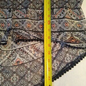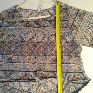 -- sheer -- looks great w-camisole or sheer tank in a layered fashion