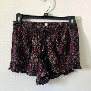 Mudd branded pull-on shortie short with pretty print and mirror like jewels, tassel tie, elastic waistband, semi-ruffled hem, flowly light weight fabric.