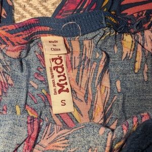 Stylish strapless jumpsuit by Mudd. Features a vibrant blue and orange pattern. Perfect for casual outings.