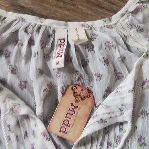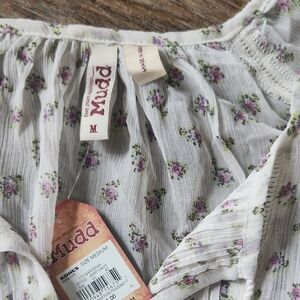 Mudd White with purple Floral details Babydoll Peasant Blouse with Puff Sleeves NWT size Medium