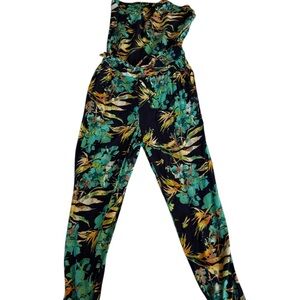 Mudd Women’s Blue & Teal Green Tropical Floral Strapless Jumpsuit Romper Sz XS