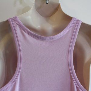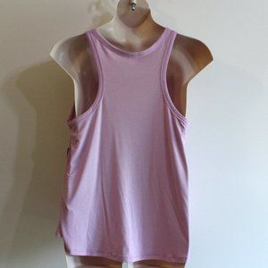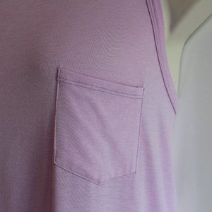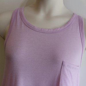 This purple tunic tank top is sleeveless with a front pocket, racer back. It has 2 1/2" side slits. It is labeled size XXL and may also fit plus size 1X or 2X. It is new with tags.