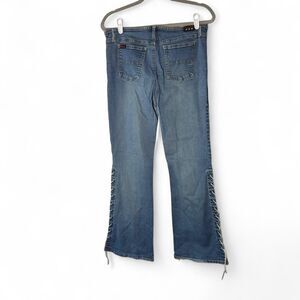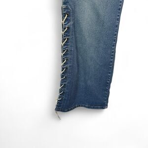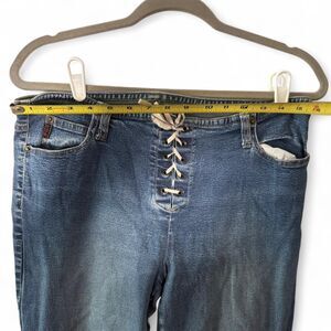 Mudd Y2K Lace Up Jeans Junior Sizing. Features lace-up details on both sides of the legs and a lace-up fly for that true early 2000s vibe. The size tag is missing, so please see measurements or ask for sizing help. Some fraying on the ends of the jeans — see pictures for details. Fair to good preowned condition, wash to wear.