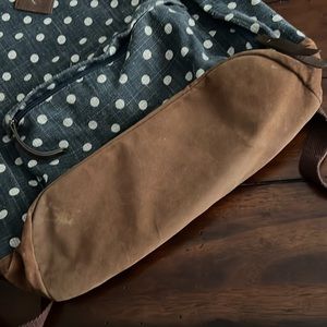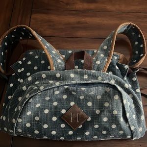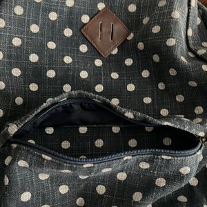 Thus denim polka dot distressed backpack is in really good shape. It’s been run through the washing machine so it’s clean and ready to use. Excellent for travel or school - very spacious.
