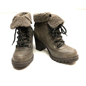 Size 6 1/2 M. These are Mudd block heel ankle booties in a nice gray in like new condition. A cute lace up bootie with faux fur around the ankle. Front tread on sole, for nice traction in the snow. Adorable. 3” heel. From Kohl’s.