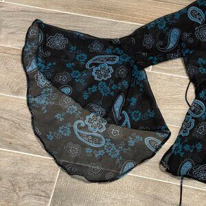 1920s style blouse blue and black bell sleeves back tie sheer size medium bust 40 waist 32 100% polyester