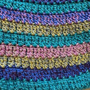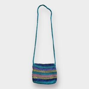 90s teal, pink, yellow and blue braided/crocheted crossbody purse. Front flap and zipper closure. Interior zipper, card, and phone pocket.