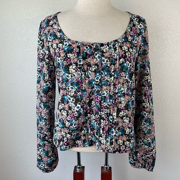 Love the cute floral design and slightly cropped fit on this top by Mudd. It measures 19 inches armpit to armpit laying flat and 20 inches in length from shoulder to hem.