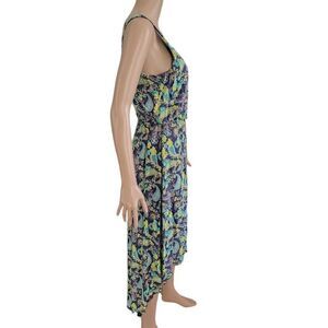 Beautiful crow blue paisley pattern, scoop neckline, sleeveless, hi-low, back cutout, button and loop closure, pull-over, lined. Perfect dress for any occasion. NWT