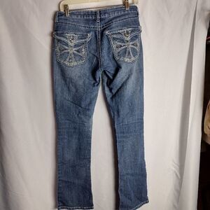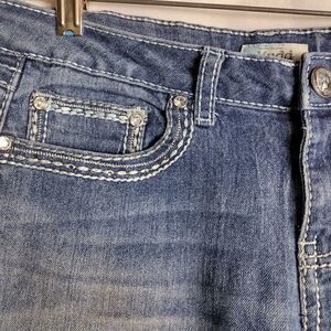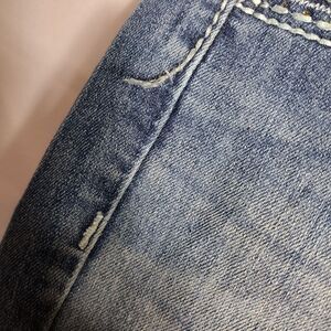 stretch denim jeans, there is a stain on the front left lower leg, see pictures. waist 15" front rise 8.5" inseam 31". one back pocket has some loose threads, see pictures.