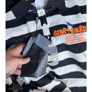 The Mudi Men's Donald Duck Polo Shirt is a size medium short sleeve striped shirt in black and white, featuring a collared neckline and button closure. Made from a blended fabric, this shirt is perfect for travel, activewear, and casual occasions. The shirt is accented with a button and logo, and is suitable for all seasons, particularly summer, fall, and spring. With a chest size of 42 inches, this regular fit polo shirt is machine washable and easy to care for. Ideal for walking, school, or hiking, this shirt adds a touch of cartoon and 90s flair to any outfit. New with Tags