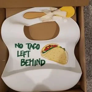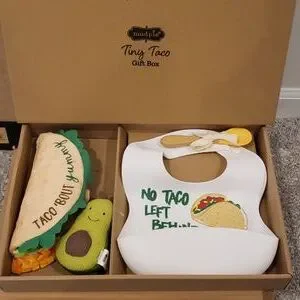 MudPie Tiny Taco Gif Box. Set includes a silicone bib and spoon, soft/crinkly baby book, and a knit avocado rattle 🌮 🥑 new in box! Make offer! Pet friendly home.
