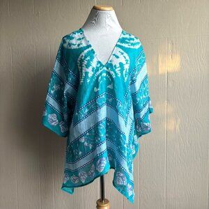 Features: This fun poncho features a teal/turquoise shell and water pattern, linen material and sewn at sides to create sleeves.