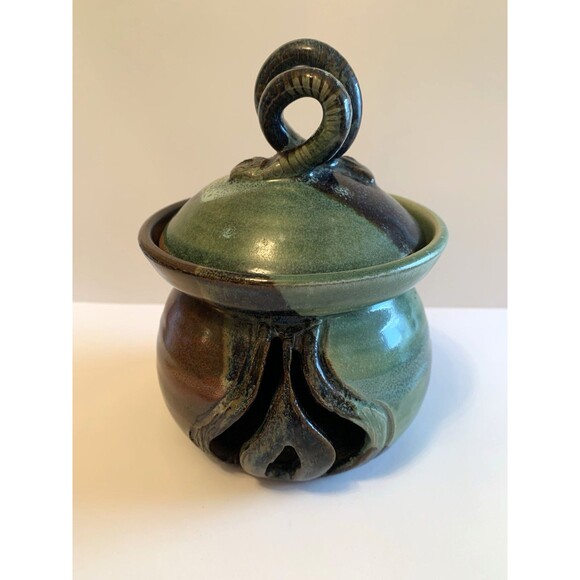 Mudworks USA Pottery. Ceramic jar/cannister with cut out vents and lid. Ideal for storing garlic. Good condition with just minor cosmetic imperfections normal for pottery. See all pictures
