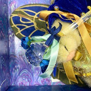 Muffy Vanderbear limited edition Butterfly bear made by the North American Bear Company was the first club bear in the VanderBear club. She is wearing a blue velvet and gold net butterfly suit with gold ruffled collar, jewels and ribbons, blue and green felt wings with gold panted veins, blue velvet slippers with a jewel on each curled and pointed toe, blue velvet cap with jewels, antennae and gold tie, crystal wand with butterflies, ribbons and flowers tied to right paw. She is approx. 8" in length.