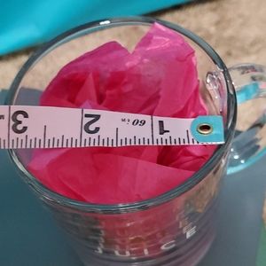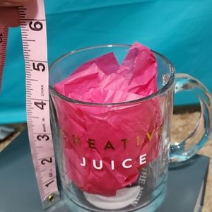 Coffee,mug,creative juice,clear glass,will hold hot liquid,not microwave safe,all dimensions are approximate, new with tag.